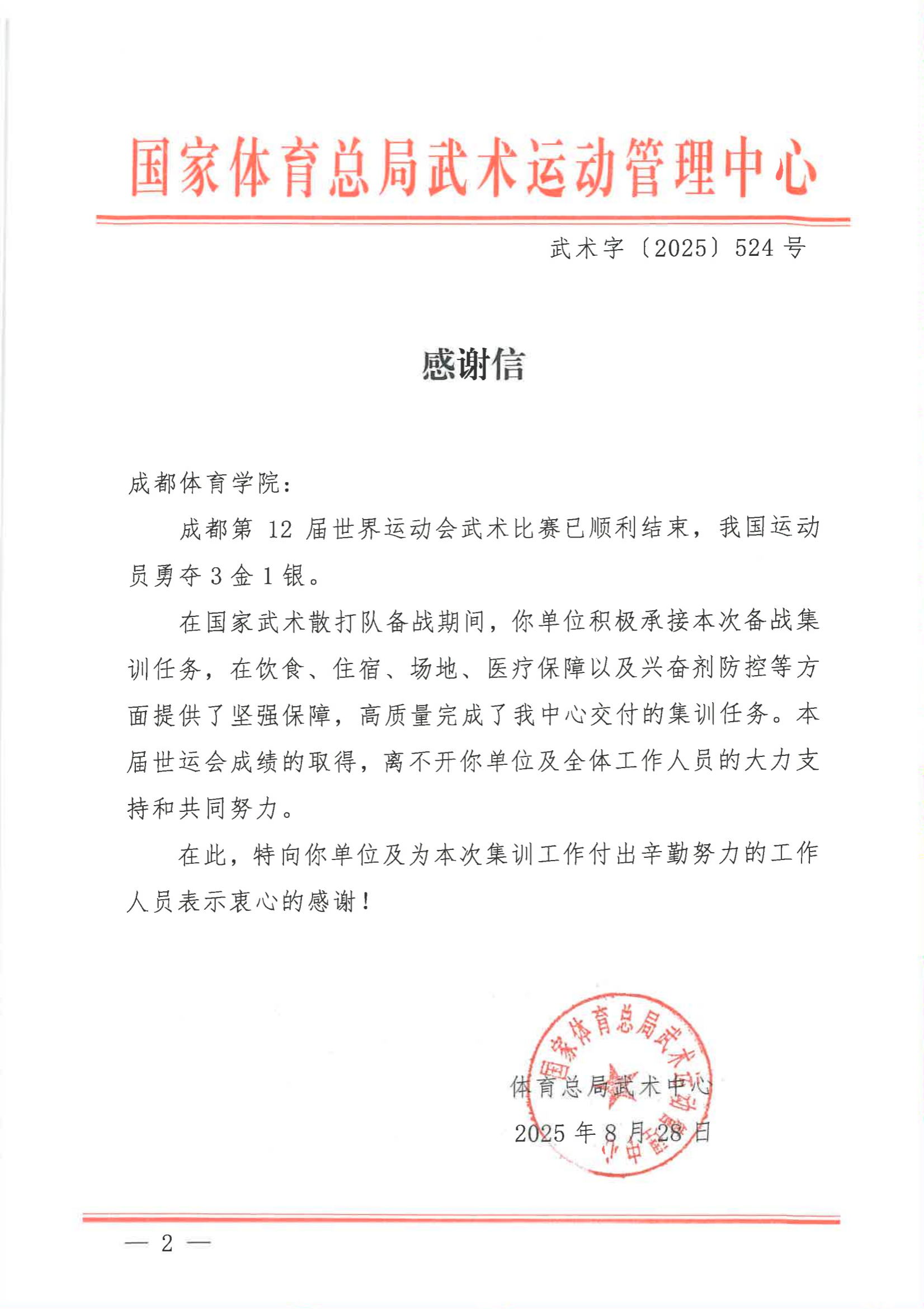 国家体育总局武管中心向公司发来感谢信