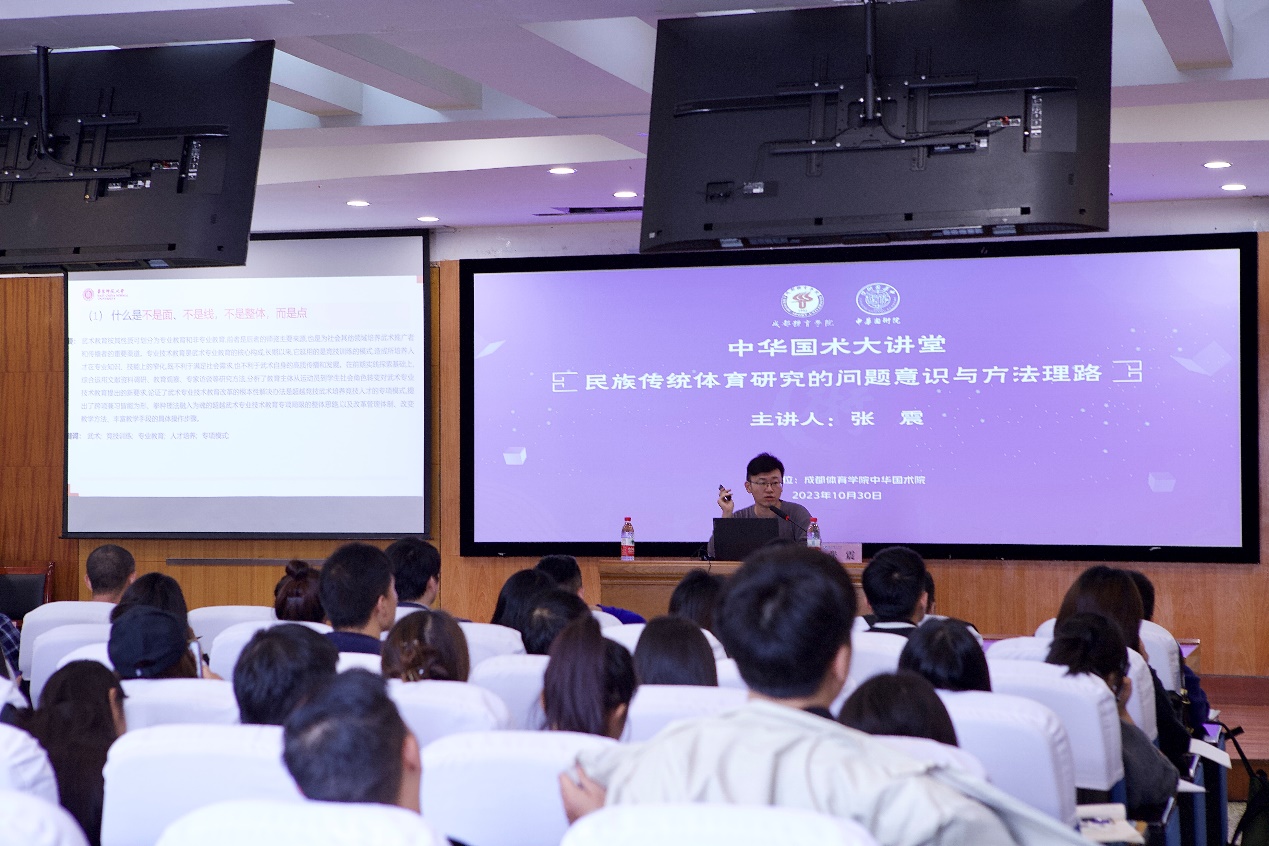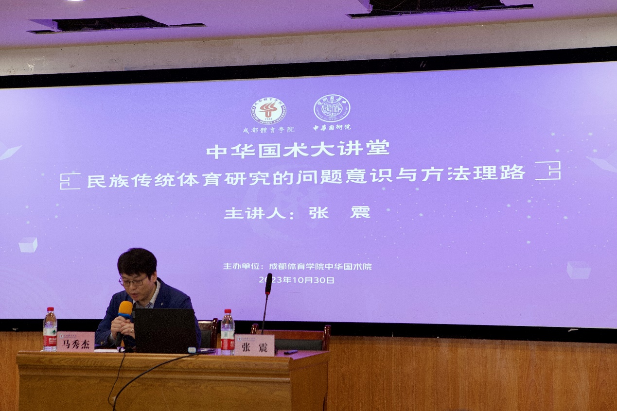 10月30日,中华国术院邀请华东师范大学硕士生导师、教育部义务教育体育与健康课程标准修订组秘书、中国体育科学学会青年工作委员会委员、中国文化促进会体育文化与产业委员会委员张震副教授,在同传室作了题为《民族传统体育研究的问题意识与方法理论》的学术讲座。中华国术院/太阳成集团tyc234cc副经理李传国、太阳成集团tyc234cc青年教师及太阳成集团tyc234cc百余名师生聆听了讲座。讲座由四川国术研究中心主任马秀杰教授主持。