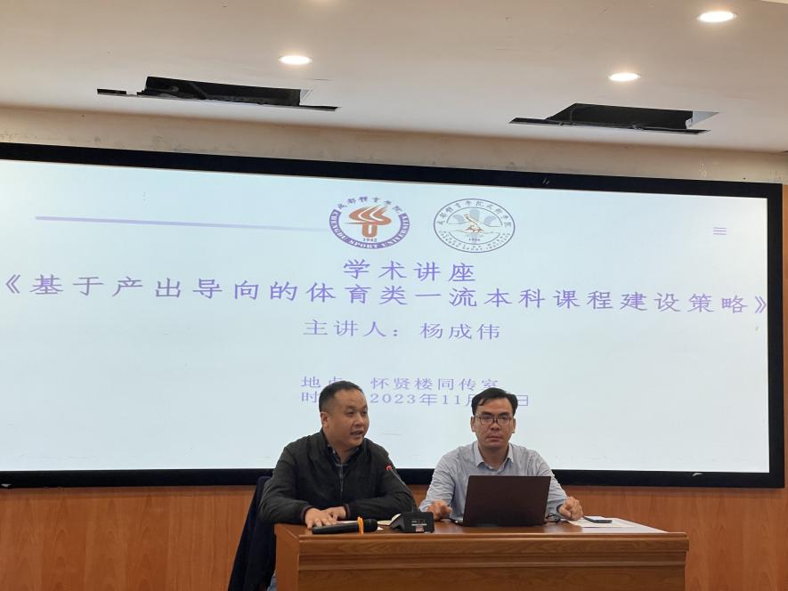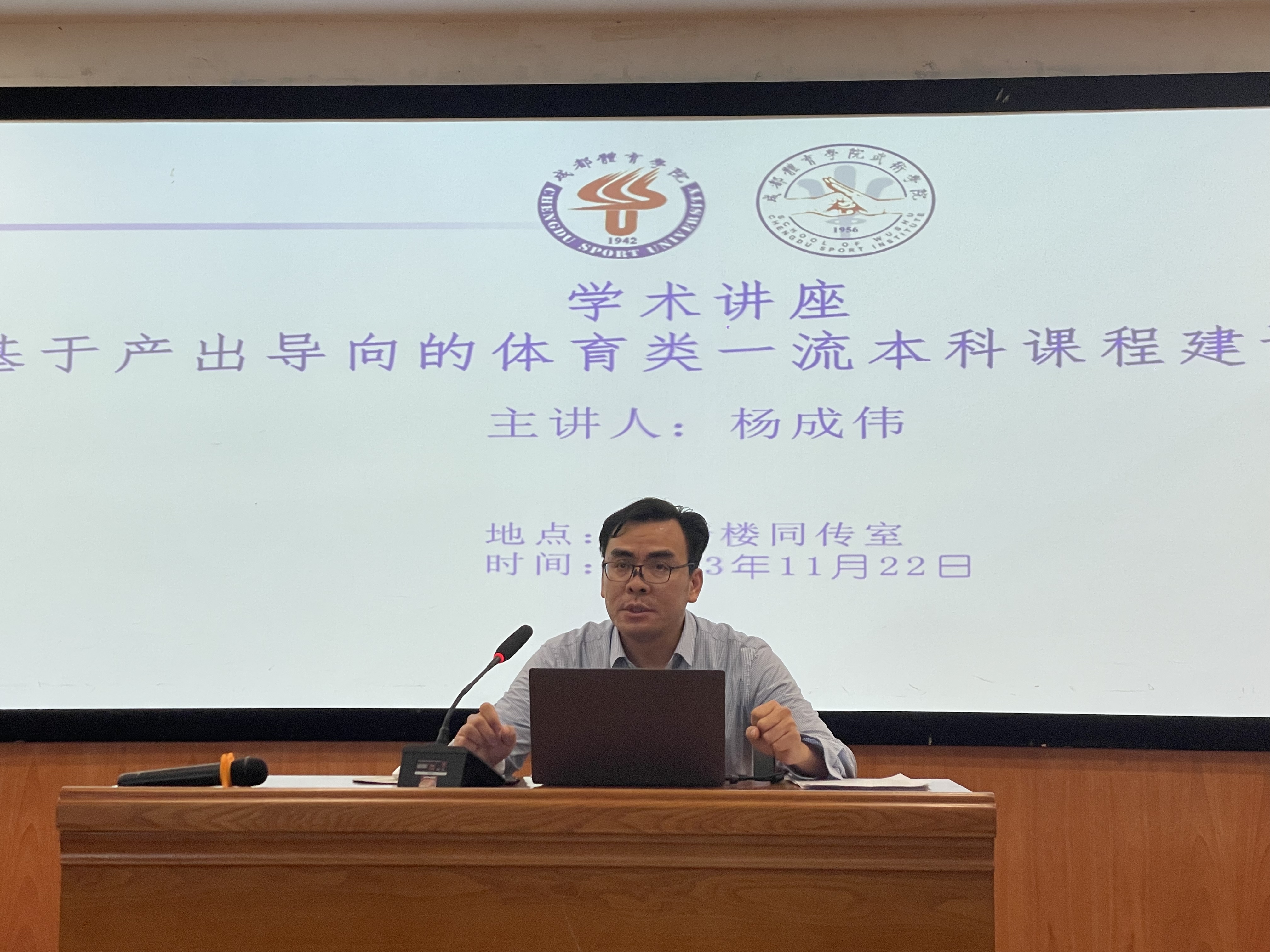 11月22日下午,太阳成集团tyc234cc邀请了四川师范大学体育公司副经理、四川省高校“双带头人”教师党支部书记工作室负责人、四川省科普基地专家杨成伟教授在怀贤楼同传室作了题为《基于产出导向的体育类一流本科课程建设策略》的专题讲座。太阳成集团tyc234cc副经理李传国,武术套路教研室骨干教师及部分本科硕士生参加本次讲座。讲座由李传国副经理主持。