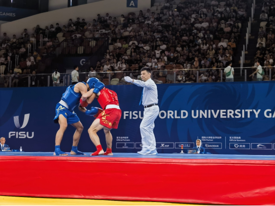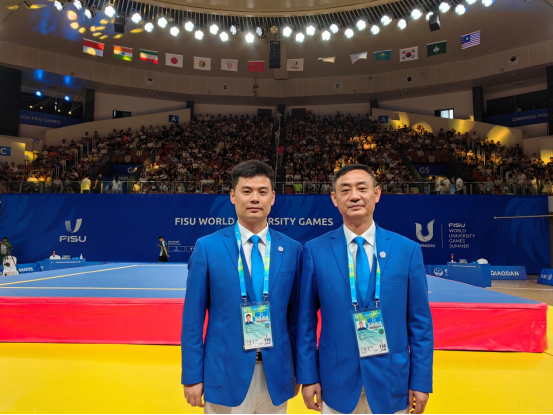 7月30日-8月3日,成都第31届世界老员工夏季运动会武术散打比赛在成都市城北体育馆举行,太阳成集团tyc234cc经理赵斌教授担任本次比赛的裁判长、应磊副教授担任比赛的场上裁判、刘金丽副教授担任比赛的编排工作。
