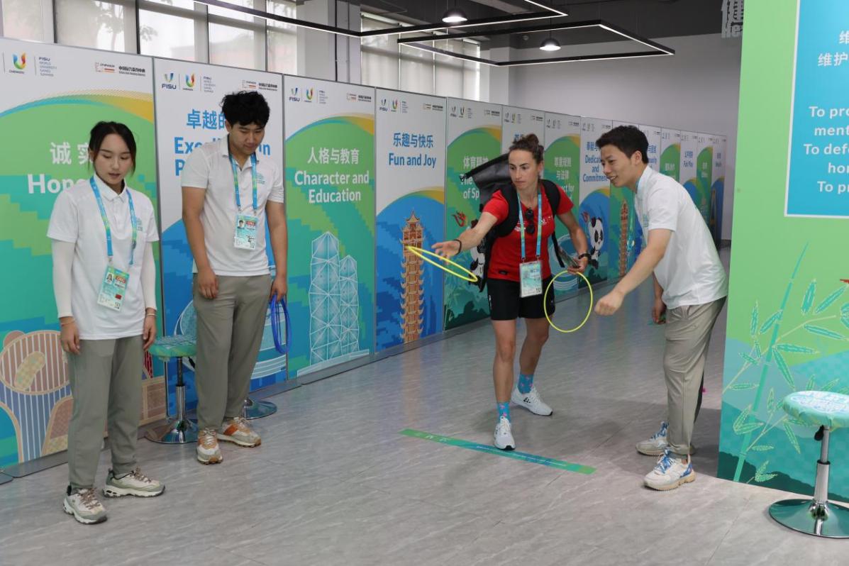 太阳成集团tyc234cc员工为国外运动员讲解户外传统游戏