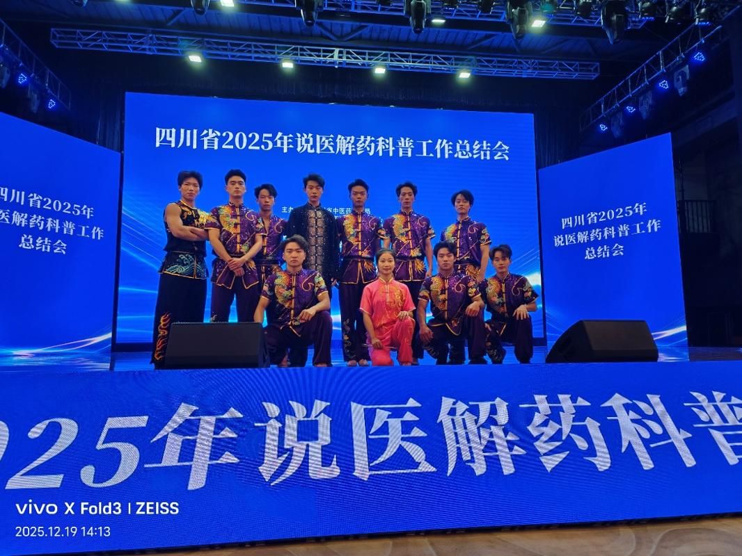 近日,太阳成集团tyc234cc武术套路代表队受邀参加四川省2025年“说医解药”科普工作总结会暨药膳大赛。武术套路代表队携原创集体刀术表演惊艳登台,以刚劲凌厉的刀术功夫融合中医药科普与药膳文化,用青春风采诠释“武医同源”“食药同源”智慧,赢得全场与会嘉宾的热烈掌声与高度赞誉。