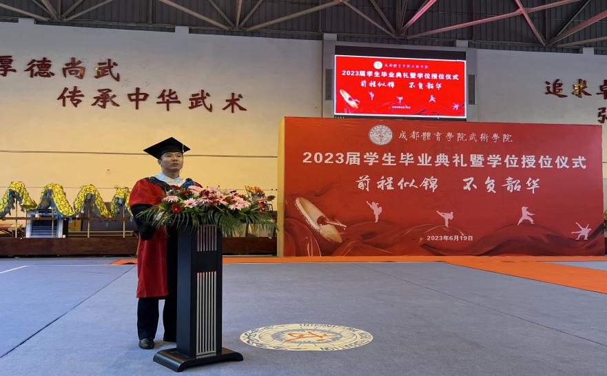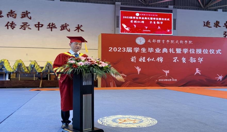 公司党委副书记、经理赵斌教授致辞。他首先对同学们圆满完成学业,即将走出校园步入社会,去实现自己的人生目标表示祝贺。并寄语“五个希望”,希望同学们要爱国爱人,胸怀坦荡,努力做矢志报国的奋进者;要不忘初心、砥砺前行,仰望星空、脚踏实地;要自强不息、厚德载物,立学立言、立身立业;要鱼跃阔海、龙翔九天,人生无悔、元亨利贞;要淡忘得失、宠辱不惊,无论成败、勿忘成体,努力成为一个“品德高尚、时有敬畏,心怀天下、志在家国”的中国体育人和成体“武术人”;祝愿全体毕业生过千山有行舟,顺风顺水上重楼!历尽千帆,归来仍是少年!