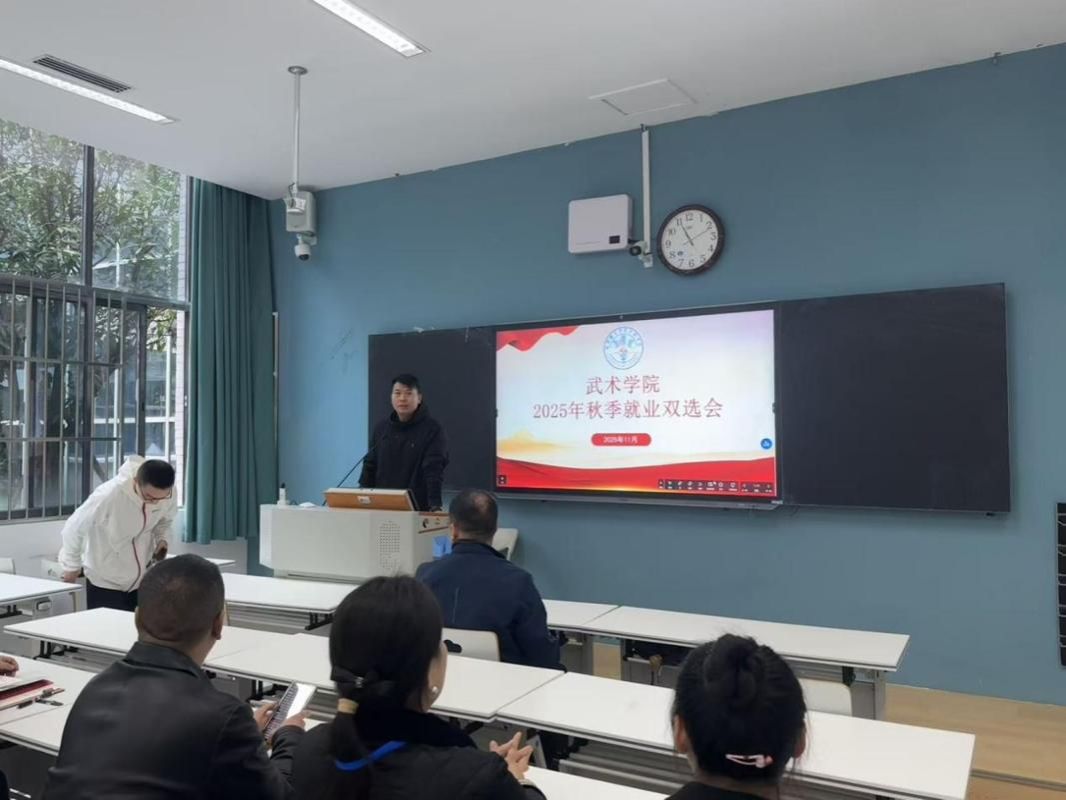 双选会现场,李阳老师先回顾了当日“蜀汇菁英”文旅产业专场招聘会成果。随后,成都市武侯区国家青少年体育俱乐部、广汉市亦德武术培训公司、青白江城厢中学等五家用人单位负责人依次宣讲,详细介绍武术套路教师、散打教练等核心岗位的招聘要求、培养体系与发展前景,提供精准就业选择。李阳老师寄语毕业生,鼓励大家主动沟通、锤炼技能,为入职理想岗位做好准备,现场不少同学达成初步意向。